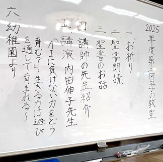 ホールに並べられられた長椅子は、在園生だけではなく、卒園生のおうちの方々も加わって満席です。子どもたちの育ちがより良いものとなるようにとの願いから、今日の「母の教室」へ参加くださいました。始まりに、当園とつながりのある教会の牧師とともに神さまにお祈りを捧げます。このひとときが、与えられた生を共に成長させられる時となりますように。新約聖書 ルカによる福音書19章を読み、牧師のお話に心を整えます。