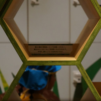 「PLAY! PARK ERIC CARL」では、裸足になって楽しみましょう。六角形の靴箱へ靴をどうぞ。「蜂の巣みたい」「知ってる!”ハニカム” っていうんだよ」。最初のお部屋へ進むと、絵本の世界に出てきそうな昆虫の標本がずらり。