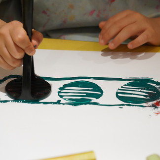 製作もしました。エリック・カールさんは、色を塗った紙を切り貼りする ”コラージュ” の手法を用いて絵本を作ったのだとか。子どもたちもいろんな道具を使って、自由に絵の具を紙に乗せていきます。押し付けたり転がしたり、滑らせたりぽんぽんと叩いたり…